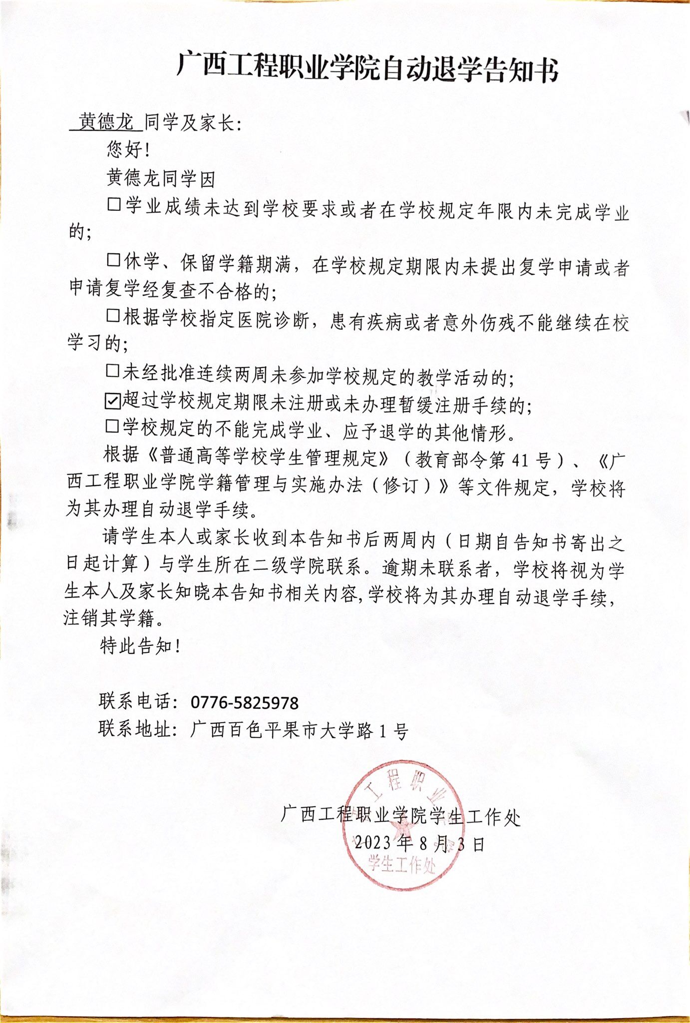 上一篇:廣西工程職業(yè)學(xué)院自動退學(xué)告知書/藝術(shù)設(shè)計學(xué)院