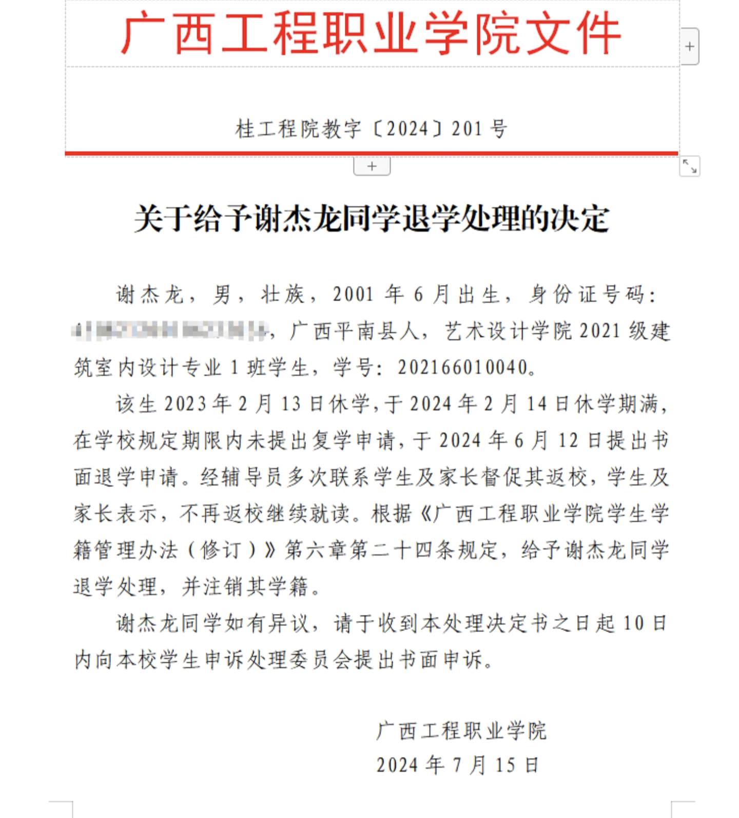 根據(jù)《普通高等學(xué)校學(xué)生管理規(guī)定》(教育部令第41號)、《廣西工程職業(yè)學(xué)院學(xué)生學(xué)籍管理辦法(修訂)》第二十四條規(guī)定,給予謝杰龍同學(xué)退學(xué)處理,并注銷其學(xué)籍。