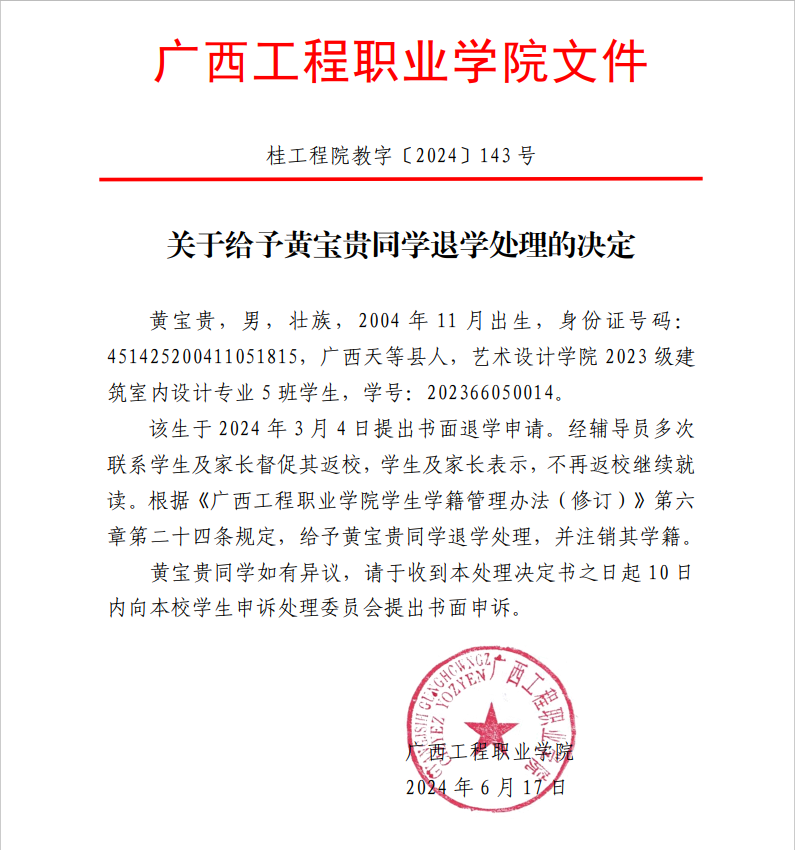 根據(jù)《普通高等學(xué)校學(xué)生管理規(guī)定》(教育部令第41號)、《廣西工程職業(yè)學(xué)院學(xué)生學(xué)籍管理辦法(修訂)》第二十四條規(guī)定,給予黃寶貴同學(xué)退學(xué)處理,并注銷其學(xué)籍。