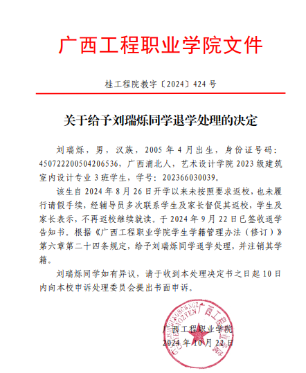 根據(jù)《普通高等學(xué)校學(xué)生管理規(guī)定》(教育部令第41號(hào))、《廣西工程職業(yè)學(xué)院學(xué)生學(xué)籍管理辦法(修訂)》第二十四條規(guī)定,給予劉瑞爍同學(xué)退學(xué)處理,并注銷(xiāo)其學(xué)籍。