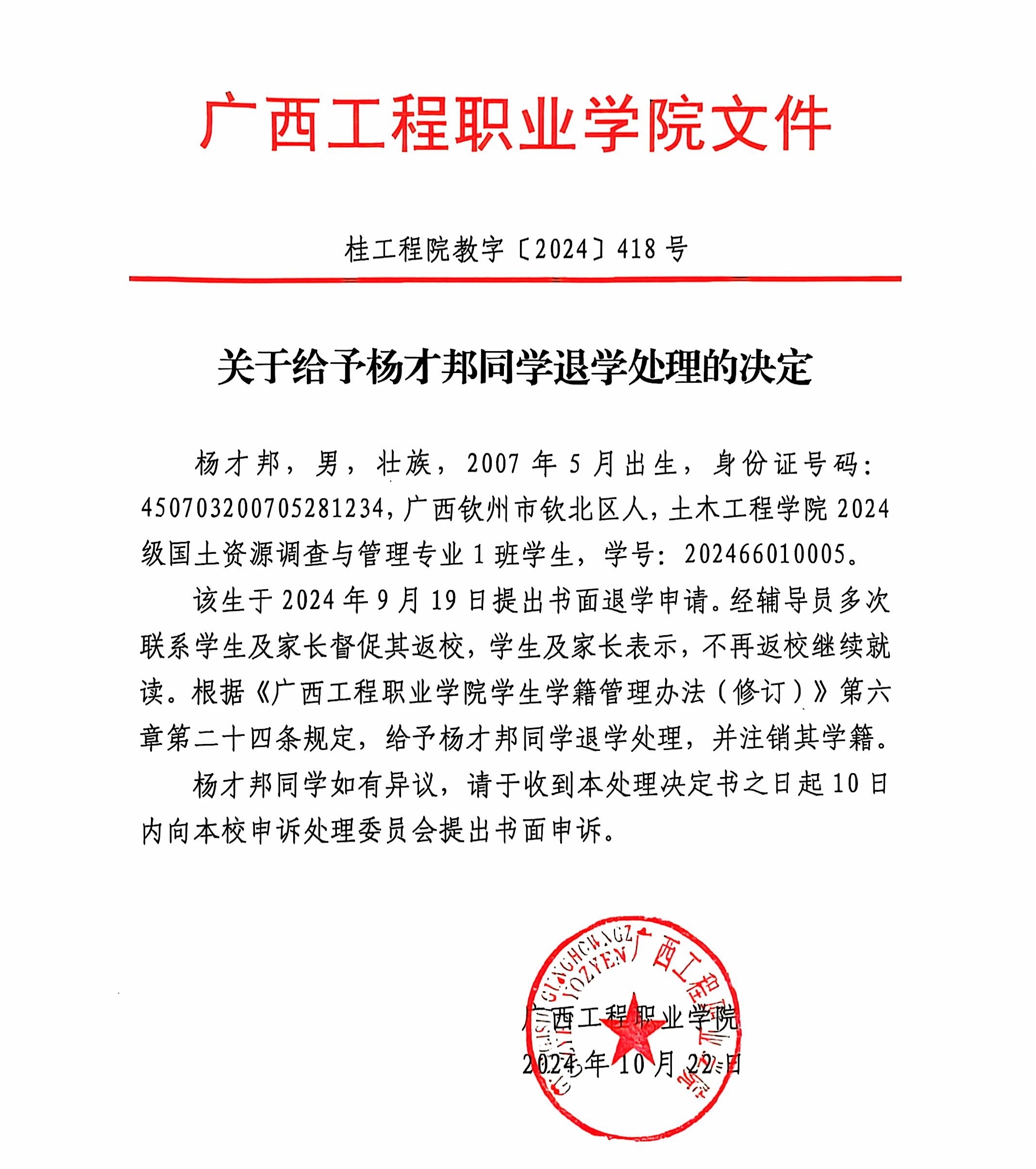 根據(jù)《普通高等學(xué)校學(xué)生管理規(guī)定》(教育部令第41號(hào))、《廣西工程職業(yè)學(xué)院學(xué)生學(xué)籍管理辦法(修訂)》第二十四條規(guī)定,給予楊才邦同學(xué)退學(xué)處理,并注銷其學(xué)籍。