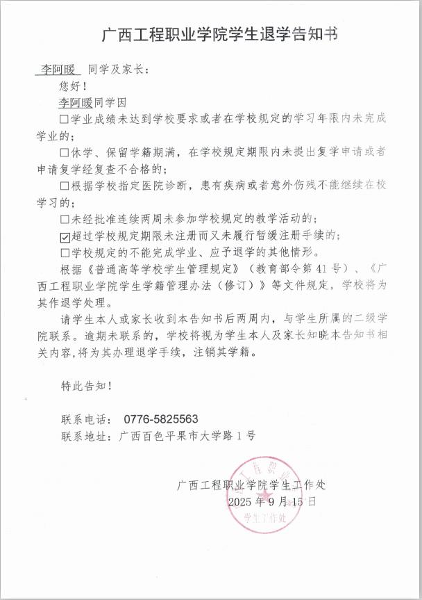 李阿暖,女,學(xué)號(hào):202466020054,藝術(shù)設(shè)計(jì)學(xué)院2024級(jí)建筑室內(nèi)設(shè)計(jì)2班學(xué)生;于2025年8月31日開(kāi)學(xué)至今未返校,超過(guò)學(xué)校規(guī)定期限未注冊(cè)而又未履行暫緩注冊(cè)手續(xù),對(duì)老師的提醒亦不回復(fù),經(jīng)多次聯(lián)系其本人及其家人均無(wú)果。學(xué)校于2025年9月16日郵寄退學(xué)告知書(shū),因不是學(xué)生本人及其家人簽收,處理告知書(shū)無(wú)法以直接送達(dá)、留置方式、郵寄方式送達(dá)本人。根據(jù)《普通高等學(xué)校學(xué)生管理規(guī)定》(教育部令第41號(hào))、《廣西工程職業(yè)學(xué)院學(xué)生學(xué)籍管理辦法(修訂)》規(guī)定,現(xiàn)通過(guò)廣西工程職業(yè)學(xué)院藝術(shù)設(shè)計(jì)學(xué)院官網(wǎng)予以公告,公告時(shí)間為2025年9月26日至2025年10月25日,公告期滿(mǎn),即視為送達(dá)。