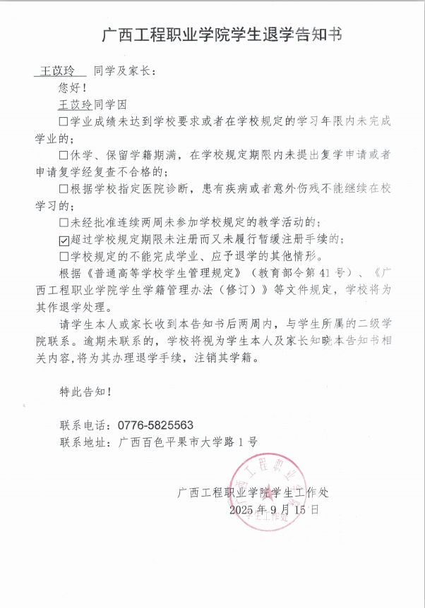 王苡玲,女,學(xué)號(hào):202466020055,藝術(shù)設(shè)計(jì)學(xué)院2024級(jí)建筑室內(nèi)設(shè)計(jì)2班學(xué)生;于2025年8月31日開學(xué)至今未返校,超過(guò)學(xué)校規(guī)定期限未注冊(cè)而又未履行暫緩注冊(cè)手續(xù),對(duì)老師的提醒亦不回復(fù),經(jīng)多次聯(lián)系其本人及其家人均無(wú)果。學(xué)校于2025年9月16日郵寄退學(xué)告知書,因不是學(xué)生本人及其家人簽收,處理告知書無(wú)法以直接送達(dá)、留置方式、郵寄方式送達(dá)本人。根據(jù)《普通高等學(xué)校學(xué)生管理規(guī)定》(教育部令第41號(hào))、《廣西工程職業(yè)學(xué)院學(xué)生學(xué)籍管理辦法(修訂)》規(guī)定,現(xiàn)通過(guò)廣西工程職業(yè)學(xué)院藝術(shù)設(shè)計(jì)學(xué)院官網(wǎng)予以公告,公告時(shí)間為2025年9月30日至2025年10月29日,公告期滿,即視為送達(dá)。