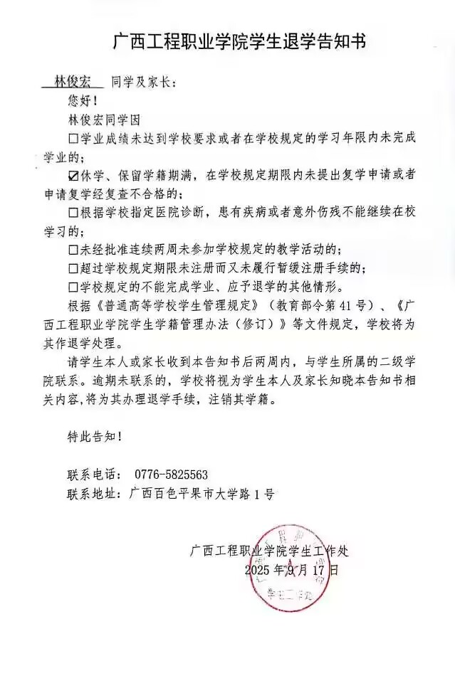 林俊宏,男,學(xué)號202366030037,藝術(shù)設(shè)計(jì)學(xué)院2023級建筑室內(nèi)設(shè)計(jì)3班;因想出去工作實(shí)踐一年,于2024年9月1日-2025年9月1日辦理休學(xué),休學(xué)期為1年,2025年9月2日休學(xué)期滿,在學(xué)校規(guī)定的期限內(nèi)未提出復(fù)學(xué)申請,對老師的提醒亦不回復(fù),經(jīng)多次聯(lián)系其本人及其家人均無果。因無法聯(lián)系本人及其家人,處理告知書無法以直接送達(dá)、留置方式、郵寄方式送達(dá)本人。根據(jù)《普通高等學(xué)校學(xué)生管理規(guī)定》(教育部令第41號)、《廣西工程職業(yè)學(xué)院學(xué)生學(xué)籍管理辦法(修訂)》規(guī)定,現(xiàn)通過廣西工程職業(yè)學(xué)院藝術(shù)設(shè)計(jì)學(xué)院官網(wǎng)予以公告,公告時(shí)間為2025年10月11日至2025年11月9日,公告期滿,即視為送達(dá)。