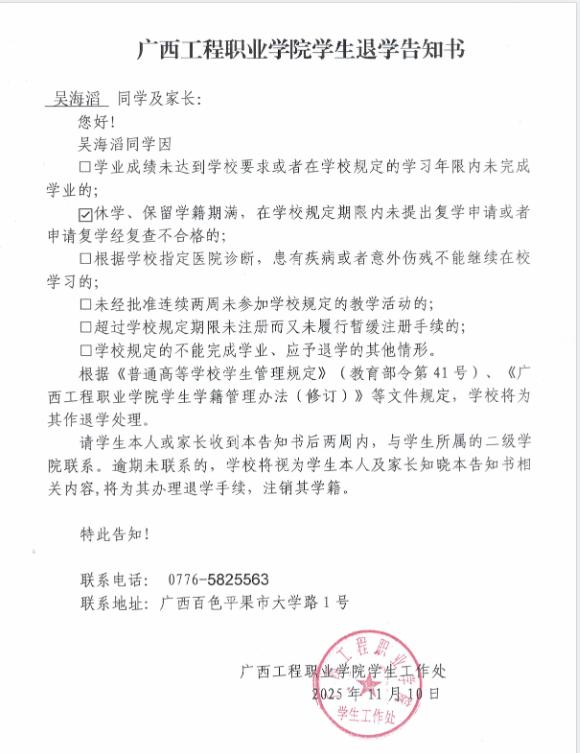 吳海滔,男,學(xué)號(hào)202366030040,藝術(shù)設(shè)計(jì)學(xué)院2023級(jí)建筑室內(nèi)設(shè)計(jì)3班;因無心學(xué)習(xí)想要外出實(shí)踐一年,于2024年10月25日-2026年10月26日辦理休學(xué),休學(xué)期為1年,2025年10月27日休學(xué)期滿,在學(xué)校規(guī)定的期限內(nèi)未提出復(fù)學(xué)申請(qǐng),對(duì)老師的提醒亦不回復(fù),經(jīng)多次聯(lián)系其本人及其家人無果。因無法聯(lián)系本人及其家人,處理告知書無法以直接送達(dá)、留置方式、郵寄方式送達(dá)本人。根據(jù)《普通高等學(xué)校學(xué)生管理規(guī)定》(教育部令第41號(hào))、《廣西工程職業(yè)學(xué)院學(xué)生學(xué)籍管理辦法(修訂)》規(guī)定,現(xiàn)通過廣西工程職業(yè)學(xué)院藝術(shù)設(shè)計(jì)學(xué)院官網(wǎng)予以公告,公告時(shí)間為2025年11月18日至2025年12月16日,公告期滿,即視為送達(dá)。