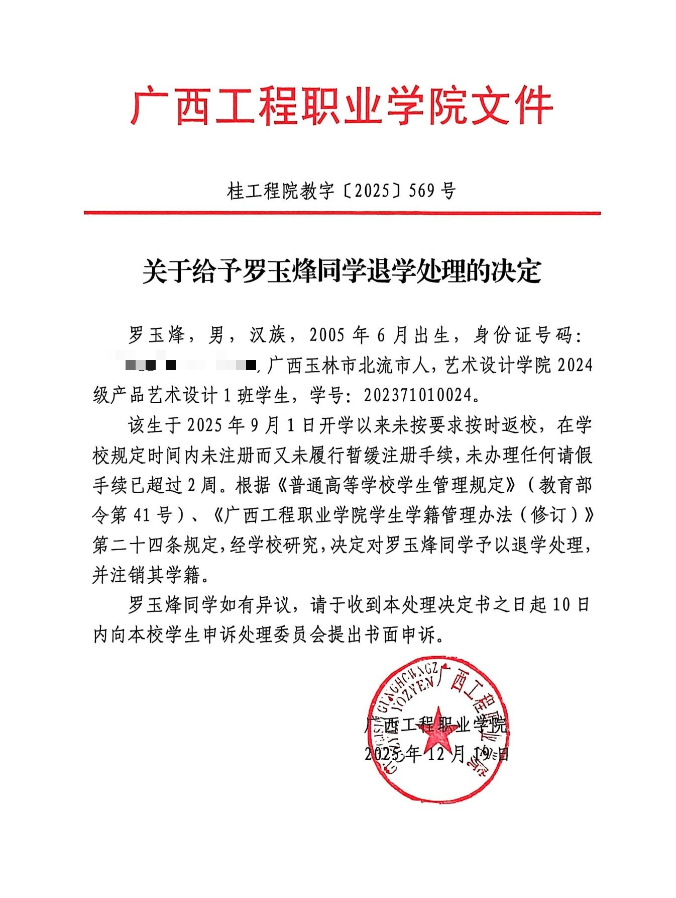 該生于2025年9月1日開學(xué)以來未按要求按時返校,在學(xué)校規(guī)定時間內(nèi)未注冊而又未履行暫緩注冊手續(xù),未辦理任何請假手續(xù)已超過2周。根據(jù)《普通高等學(xué)校學(xué)生管理規(guī)定》(教育部令第41號)、《廣西工程職業(yè)學(xué)院學(xué)生學(xué)籍管理辦法(修訂)》第二十四條規(guī)定,經(jīng)學(xué)校研究,決定對羅玉烽同學(xué)予以退學(xué)處理,并注銷其學(xué)籍。