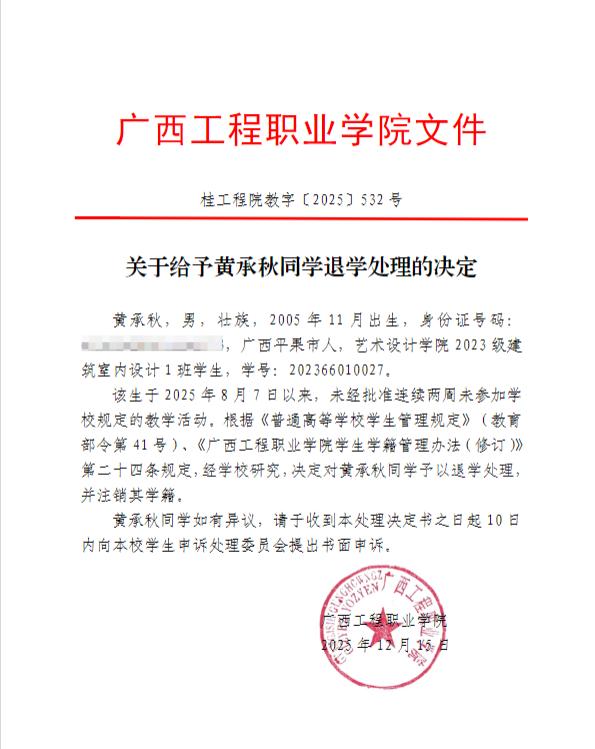 現根據《普通高等學校學生管理規(guī)定》(教育部令第41號)、《廣西工程職業(yè)學院學生學籍管理辦法(修訂)》第二十四條規(guī)定,經學校校長辦公會研究,決定給予黃承秋退學處理,同時注銷其學籍。