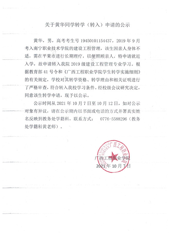 關(guān)于黃華同學(xué)轉(zhuǎn)學(xué)(轉(zhuǎn)入)申請的公示
