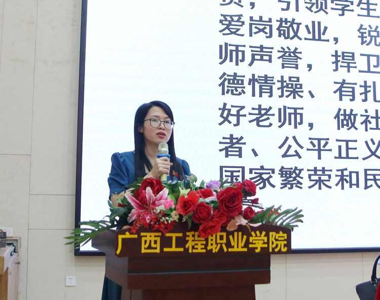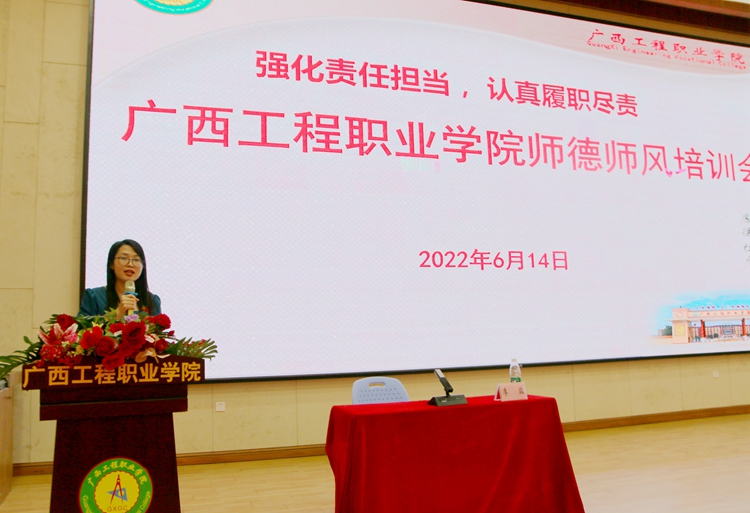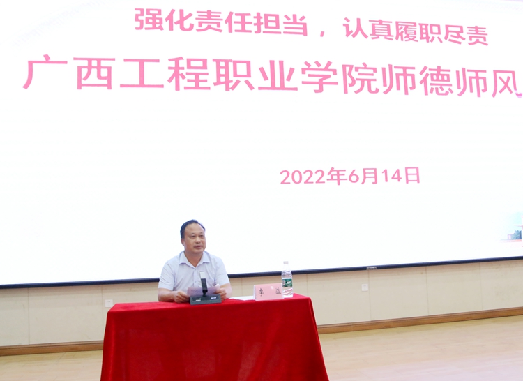 為進(jìn)一步推進(jìn)學(xué)校師德師風(fēng)建設(shè),落實(shí)立德樹(shù)人根本任務(wù),著力建設(shè)一支政治素質(zhì)過(guò)硬、作風(fēng)優(yōu)良、品德高尚、能力過(guò)硬的教師隊(duì)伍,6月14日下午,廣西工程職業(yè)學(xué)院“強(qiáng)化責(zé)任擔(dān)當(dāng) 認(rèn)真履職盡責(zé)”師德師風(fēng)培訓(xùn)會(huì)在圖文信息大樓學(xué)術(shù)報(bào)告廳舉行。紀(jì)委書(shū)記、副校長(zhǎng)彭高彬作了題為《堅(jiān)持立德樹(shù)人 做四有好老師》的專題培訓(xùn)。學(xué)校黨政領(lǐng)導(dǎo)班子出席培訓(xùn)會(huì),全體教職工參會(huì),會(huì)議由黨委副書(shū)記黃秋霞主持。