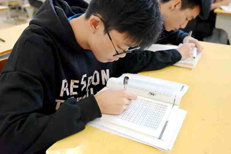 同學(xué)們在課堂上認(rèn)真書寫廉潔書法
