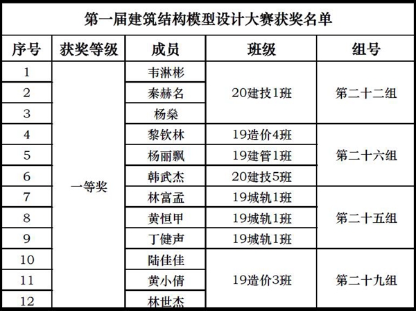 附:第一屆建筑結(jié)構(gòu)模型設(shè)計(jì)大賽獲獎(jiǎng)名單