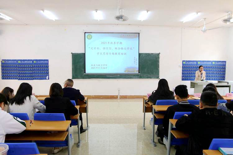 為進(jìn)一步加強大學(xué)生思想政治教育,培育和踐行社會主義核心價值觀,促進(jìn)廣大青年在新時代中主動作為、勇?lián)?zé)任,踐行“請黨放心、強國有我”青春誓言,11月25日下午,學(xué)校鐵道與航空學(xué)院在新經(jīng)管樓102室召開2021年秋季學(xué)期“定目標(biāo),強信念,做合格大學(xué)生”學(xué)生思想專題教育培訓(xùn)。校黨委委員、副校長彭高彬作專題講座,鐵道與航空學(xué)院黨支部書記、副院長覃鳳姣,學(xué)生科科長謝小玲、全體輔導(dǎo)員以及2020級學(xué)生代表參加培訓(xùn)。