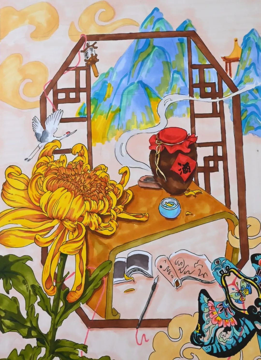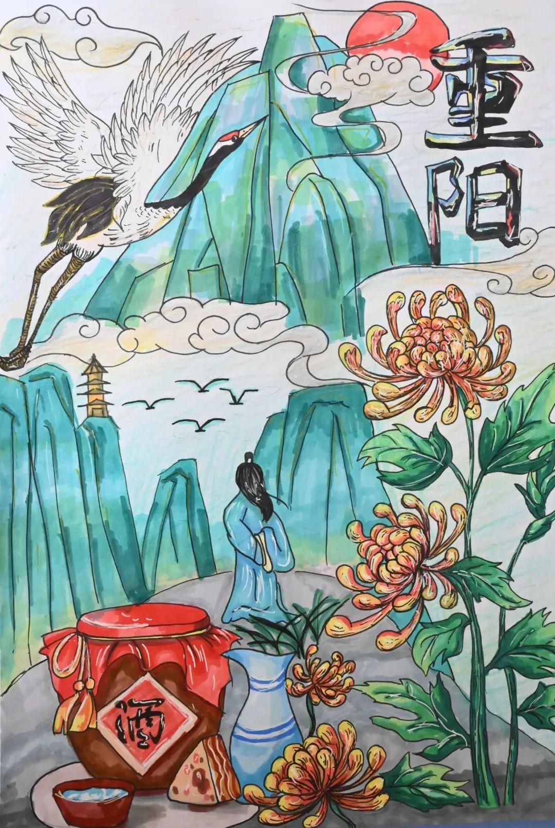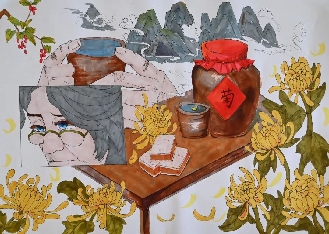 展出作品風(fēng)格迥異,內(nèi)容豐富、色彩多樣,每一幅作品都展示了重陽文化特點(diǎn),寄托對老人健康長壽的祝福,對于家人的思念。