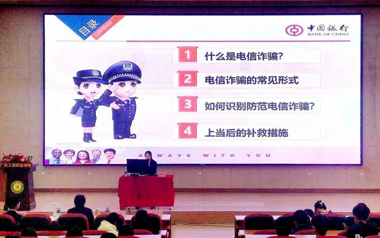 在培訓(xùn)過程中,中國銀行平果市支行副行長蘇駿、副主任張嬋、黃秋楓分別為同學(xué)們進(jìn)行講解,他們結(jié)合鮮活的案例,詳細(xì)介紹了當(dāng)前常見的電信詐騙手段、特點(diǎn)、形式和危害。他們通過講解和分析真實(shí)案例等,讓師生們深入了解犯罪分子的詐騙伎倆,提醒大家提高警惕,防范金融電信詐騙。