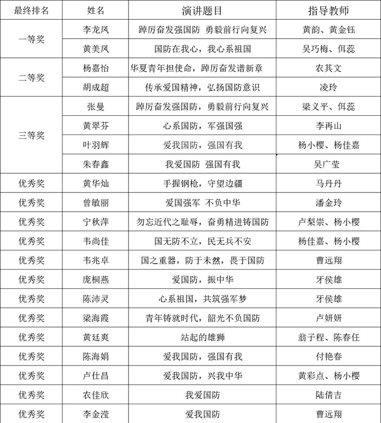 附:廣西工程職業(yè)學(xué)院2023年“愛(ài)我國(guó)防”演講比賽獲獎(jiǎng)名單
