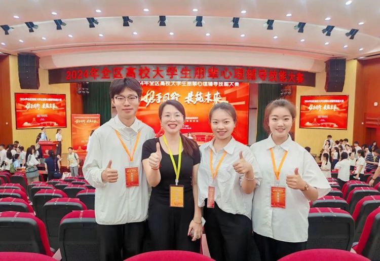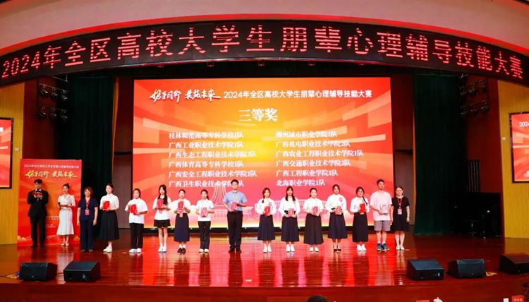5月25—26日,由自治區(qū)教育廳主辦的2024年全區(qū)高校大學(xué)生朋輩心理輔導(dǎo)技能大賽決賽在廣西財經(jīng)學(xué)院相思湖校區(qū)舉行。我校參賽隊伍(隊員:張曼、胡成超、黃敏;指導(dǎo)老師:黃秋霞、李麗詩、凌艷婷)在決賽中表現(xiàn)優(yōu)異,榮獲三等獎。