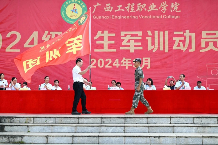 圖為黨委書記、督導(dǎo)專員蒙本曼為軍訓(xùn)團(tuán)授軍訓(xùn)團(tuán)團(tuán)旗。