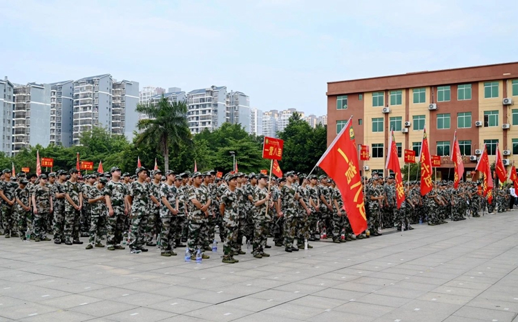 伴隨著莊嚴(yán)激昂的國歌,五星紅旗冉冉升起。全體師生面向國旗肅立敬禮,軍訓(xùn)動(dòng)員大會(huì)拉開序幕。