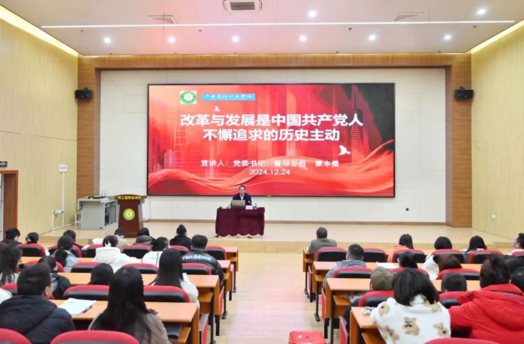 黨委書記、督導專員蒙本曼作題為《改革與發(fā)展是中國共產(chǎn)黨人不懈追求的歷史主動》的專題培訓,深刻闡述了“改革具有舉旗定向的里程碑意義”“發(fā)展是改革的落腳點和必由之路”和“改革與發(fā)展當并駕齊驅相輔相成”三部分內(nèi)容。他要求全體教師要把歷史主動精神融入新時代立德樹人全過程,解放思想、深化改革、強化使命擔當,大力弘揚教育家精神,不斷提高師德修養(yǎng),努力成為“大先生”,當好引路人,以釘釘子精神推動學校各項教育改革舉措落地生根、開花結果,培養(yǎng)更多適應新質生產(chǎn)力要求的創(chuàng)新型技術技能型人才,為全面建成社會主義現(xiàn)代化強國、實現(xiàn)第二個百年奮斗目標,以中國式現(xiàn)代化全面推進中華民族偉大復興作出廣工程院人的新貢獻。