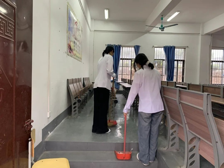 在教學(xué)樓里,志愿者們仔細(xì)清掃樓梯和走廊,確保每一處角落都干凈整潔。
