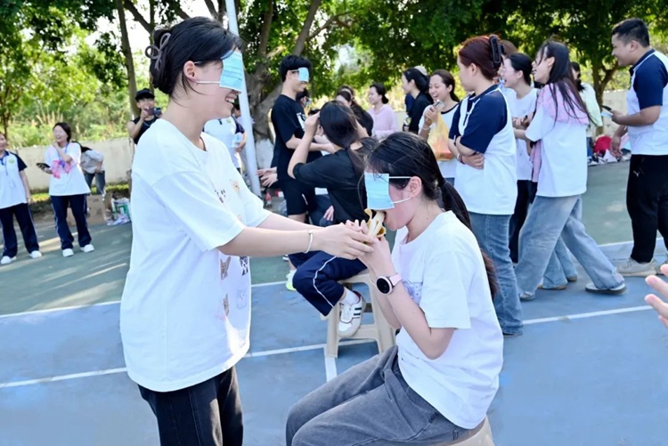 蒙眼吃香蕉的游戲吸引眾多人員參與,活動區(qū)域早早便圍滿了躍躍欲試的師生。游戲規(guī)則簡潔而充滿懸念:參與者需蒙上眼罩,在隊友的語言指引下,找到指定位置的香蕉,完成剝皮并吃完,用時最短者獲勝。蒙眼吃香蕉項目不僅是一場趣味游戲,更是一次信任與默契的考驗。指引者需要保持冷靜,用清晰準確的語言為蒙眼的隊友指明方向;而挑戰(zhàn)者則要克服內(nèi)心的不安,完全信任隊友的指引。在這個過程中,每一次成功的配合都讓參與者感受到了團隊的溫暖,每一次意外的狀況也都成為了歡樂的源泉。