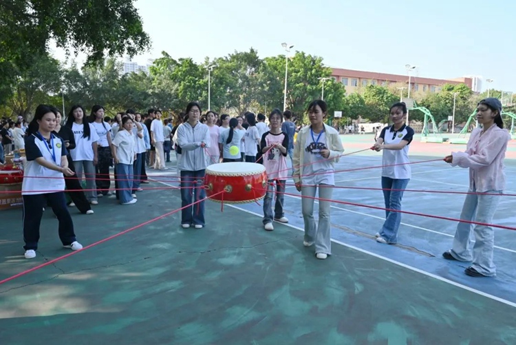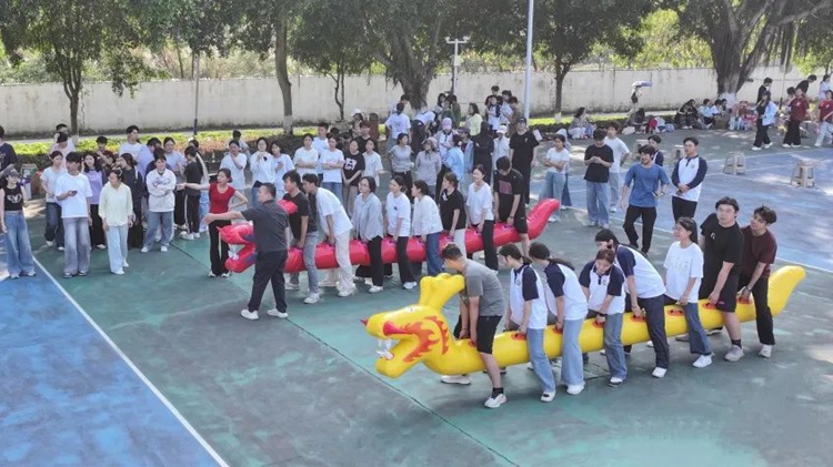 首先登場的是旱地龍舟項目。參賽隊員們兩兩并排,隊員跨坐龍舟兩側(cè),雙手提拉龍舟把手在特制的“龍舟”道具上,齊心協(xié)力喊著口號,步伐一致地向前邁進。“一二一,一二一”,整齊有力的口號聲響徹籃球場。活動競爭激烈,大家都奮勇向前。有的小組配合默契,猶如離弦之箭飛速前進;有的小組在途中雖出現(xiàn)一些小狀況,但隊員們迅速調(diào)整狀態(tài),相互鼓勵,不氣餒不放棄,堅持完成比賽。該項目充分考驗了團隊的協(xié)作能力和默契程度,讓師生們深刻體會到團結(jié)的力量,在比賽中不僅收獲了快樂,更收獲了團隊的凝聚力。