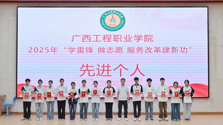 圖為汽車與機(jī)電學(xué)院學(xué)生科科長陸新鋒為獲得2025年“學(xué)雷鋒 做志愿 服務(wù)改革建新功”先進(jìn)個(gè)人榮譽(yù)稱號的學(xué)生代表頒獎
