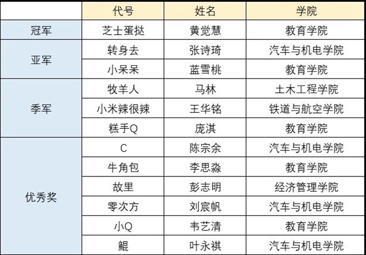 圖為廣西工程職業(yè)學(xué)院汽車與機(jī)電學(xué)院《蒙面歌王》大賽獲獎(jiǎng)名單