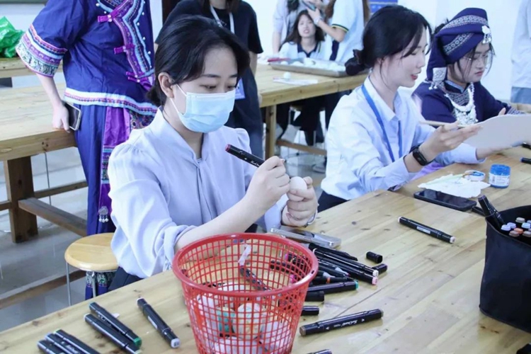 以“傳統(tǒng)+創(chuàng)意”雙主題繪制彩蛋:傳統(tǒng)主題圍繞艾草、龍舟等自然紋樣與吉祥符號,融入青、紅、黃、白、黑五行色彩;創(chuàng)意主題則涵蓋Q版屈原、星空幾何等新穎元素,師生們還在彩蛋上書寫祝福語,讓古老習(xí)俗煥發(fā)出青春活力。