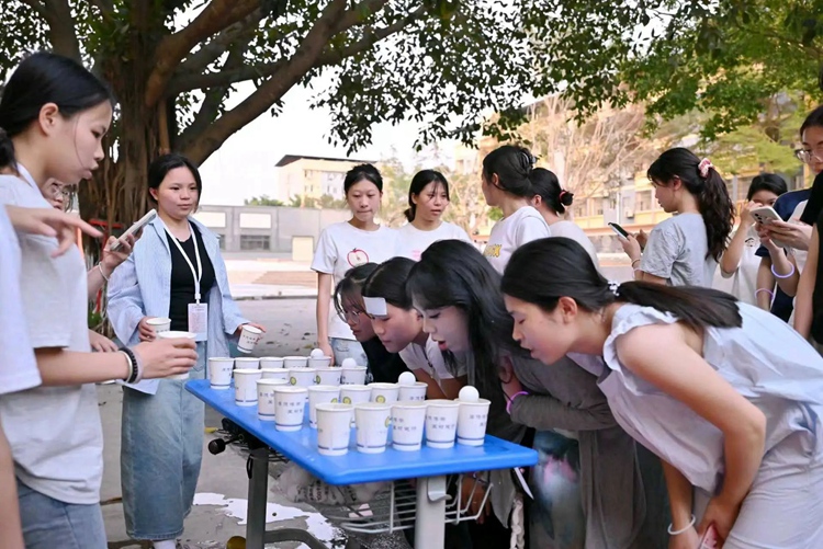 選手們屏氣凝神,對著漂浮在水杯上的乒乓球奮力吹氣,有的掌握技巧,一氣呵成完成挑戰(zhàn),有的因用力過猛濺起水花引得現(xiàn)場笑聲連連。
