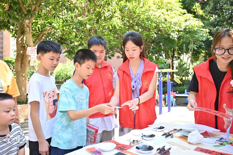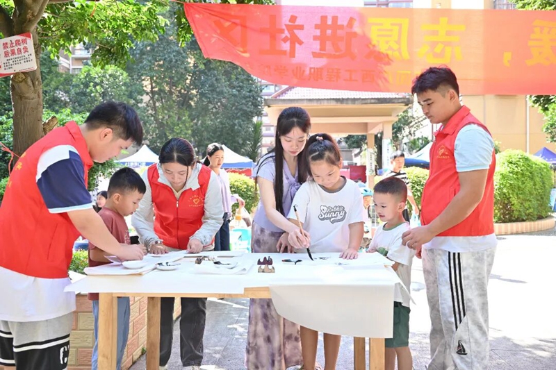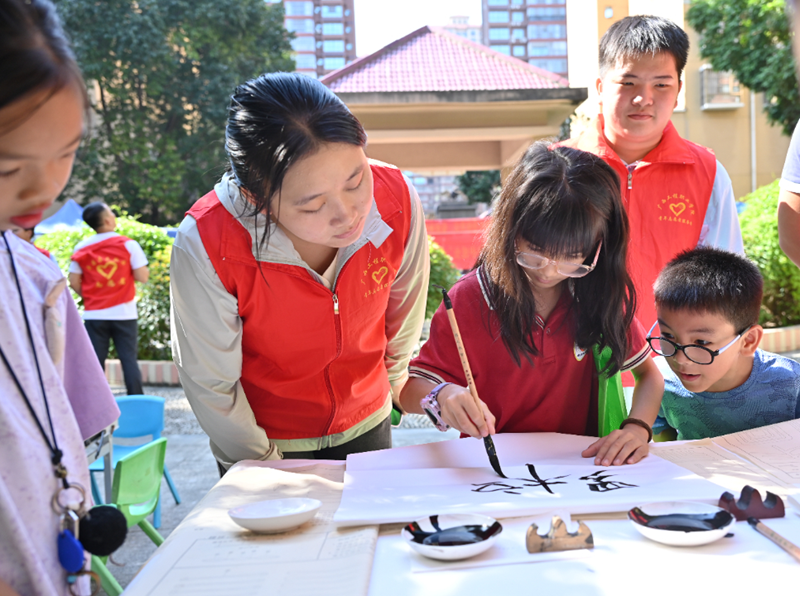 書法傳情活動現(xiàn)場,志愿者們耐心指導(dǎo)社區(qū)居民揮毫潑墨,孩子們在旁認真觀摩學習,墨香與書香交織,傳統(tǒng)文化在互動中傳承,志愿溫情浸潤人心。