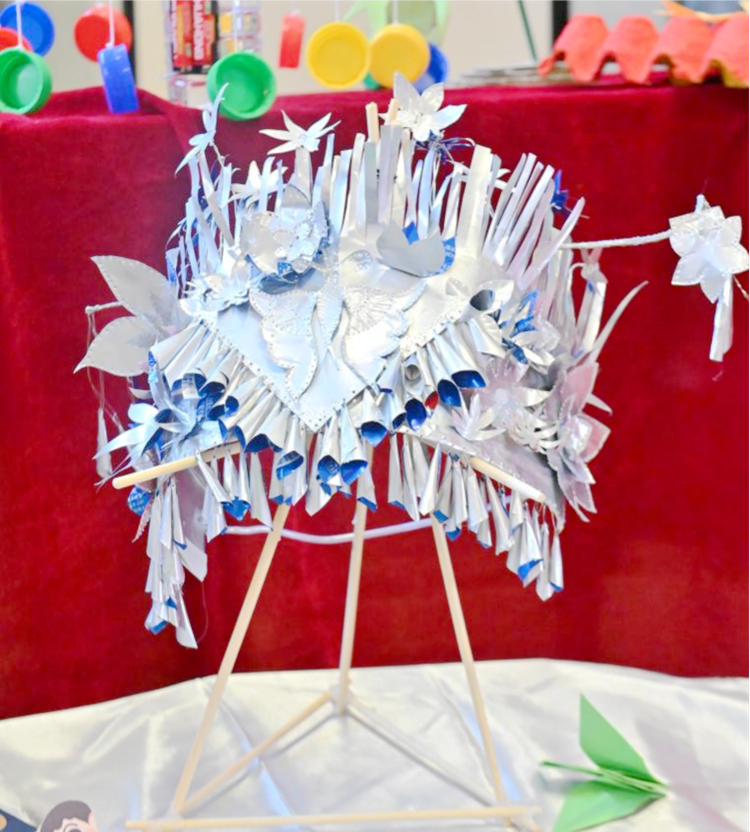 在此次活動中,各班同學(xué)積極參與,每一件作品都是以生活中毫不起眼的廢舊物品做成的。
