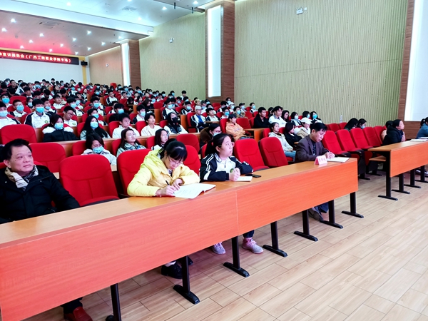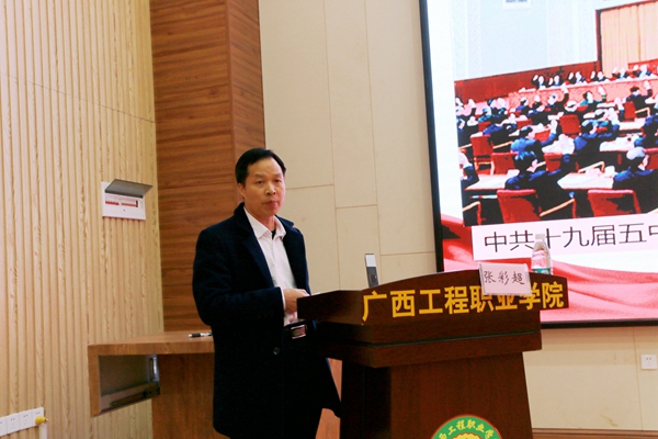 2020年12月30日下午,平果市宣講團成員、平果市委黨校高級講師張彩超在我校圖文信息大樓學(xué)術(shù)報告廳宣講學(xué)習(xí)貫徹黨的十九屆五中全會精神,學(xué)校黨委書記呂偉斌,黨委委員、招生就業(yè)處處長龐英連,黨委委員、黨委辦公室副主任李麗詩等黨委領(lǐng)導(dǎo)和師生共400多人參加。宣講報告會由黨委書記呂偉斌主持。