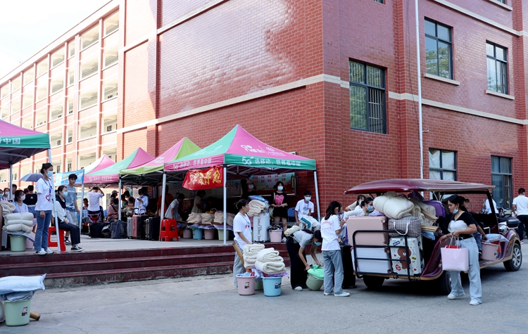 在校內(nèi),學校開通新生入學報到綠色通道,張貼入學報到流程,設(shè)置接待、引領(lǐng)、咨詢、行李寄存、各二級學院(部)注冊區(qū)、生活物品領(lǐng)取、校園觀光車送新生到宿舍等服務(wù)崗;同時,為進一步提高迎新工作效率、提升迎新工作質(zhì)量,學校還進一步優(yōu)化了迎新系統(tǒng),新生可在線上完成信息采集、繳費等一系列手續(xù),讓入學報到變得更為智能便捷。