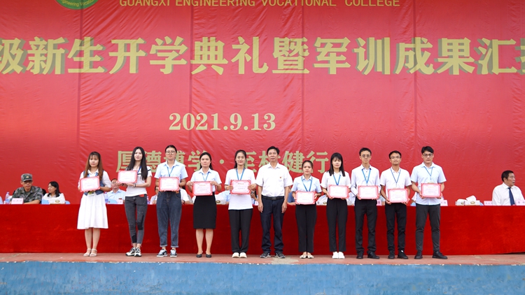 學(xué)校黨委委員、副校長(zhǎng)、宣傳部長(zhǎng)彭高彬宣讀《廣西工程職業(yè)學(xué)院關(guān)于2021級(jí)新生軍訓(xùn)先進(jìn)集體和先進(jìn)個(gè)人的表彰決定》,郭乃瑛、李榮寧等311名同學(xué)榮獲“軍訓(xùn)標(biāo)兵”榮譽(yù)稱(chēng)號(hào),田紅靜、成天祺等21位老師榮獲“軍訓(xùn)優(yōu)秀帶班班主任”榮譽(yù)稱(chēng)號(hào),張騰、蘇寶等11名教官榮獲“軍訓(xùn)優(yōu)秀帶班教官”榮譽(yù)稱(chēng)號(hào),八營(yíng)二連、七營(yíng)六連等6個(gè)連隊(duì)榮獲先進(jìn)集體榮譽(yù)稱(chēng)號(hào)。出席大會(huì)的領(lǐng)導(dǎo)嘉賓分別為獲得榮譽(yù)稱(chēng)號(hào)的集體和個(gè)人頒發(fā)榮譽(yù)證書(shū)和錦旗。