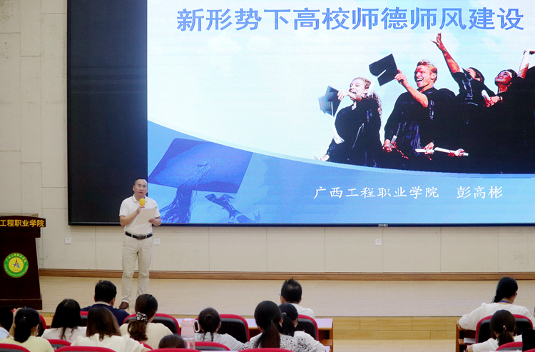 彭高彬副校長以“新形勢下高校師德師風(fēng)建設(shè)”為主題,從加強(qiáng)教師職業(yè)道德建設(shè)的重要意義、高校教師職業(yè)道德規(guī)范、廣西工程職業(yè)學(xué)院教師職業(yè)道德規(guī)范、新形勢下應(yīng)著重突出的師德內(nèi)涵等四個(gè)方面,結(jié)合自身的教育教學(xué)經(jīng)歷及師德規(guī)范典型事例,用幽默風(fēng)趣的語言,深入淺出地闡述了如何成為一名好教師。