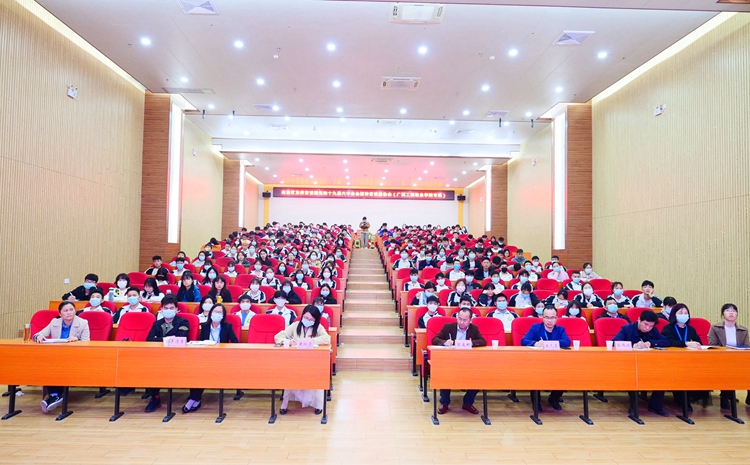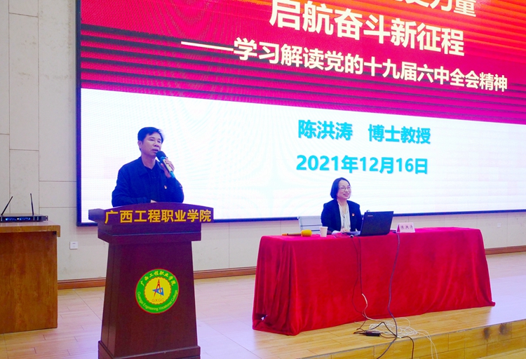 12月16日下午,在學(xué)校圖文信息大樓一樓學(xué)術(shù)報(bào)告廳,自治區(qū)黨委教育工委宣講團(tuán)成員陳洪濤教授作主題為“黨的十九屆六中全會(huì)精神”宣講報(bào)告。學(xué)校黨委書記呂偉斌,黨委委員、副校長(zhǎng)彭高彬,副校長(zhǎng)吳先夏,校長(zhǎng)助理黃秋霞、覃清香等領(lǐng)導(dǎo),各部門負(fù)責(zé)人、各黨(總)支部書記、師生黨員、學(xué)生代表等400多人參加報(bào)告會(huì)。報(bào)告會(huì)由呂偉斌主持。