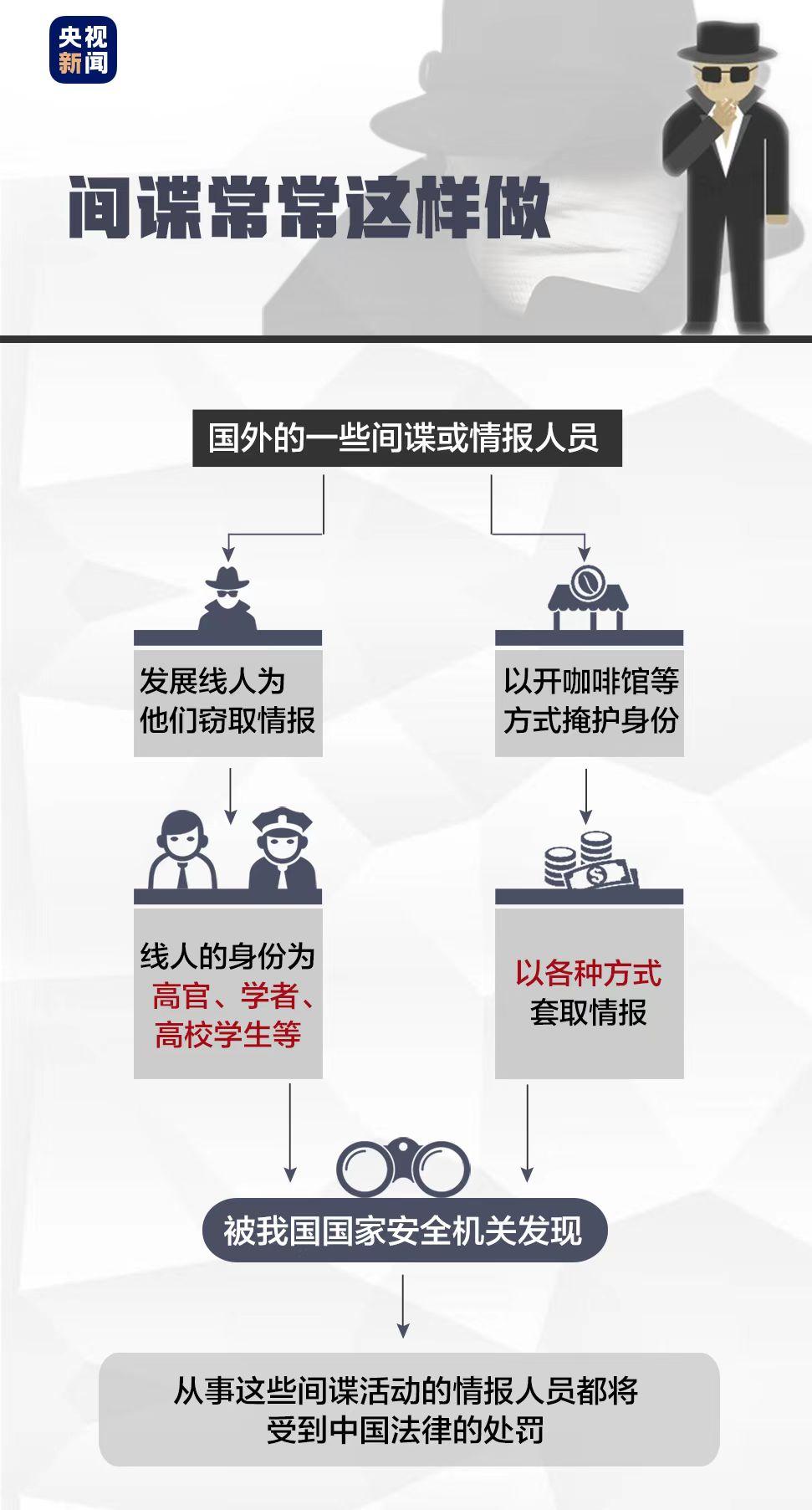 以上種種行為,一經我國國家安全機關發(fā)現,從事這些間諜活動的情報人員都將受到中國法律的處罰!