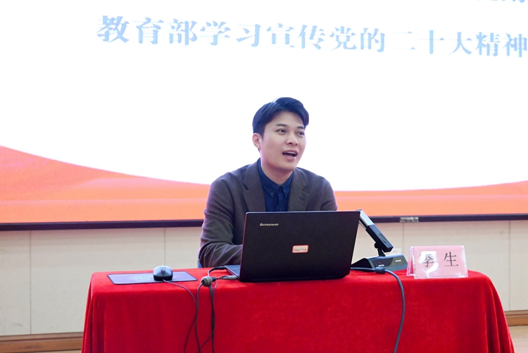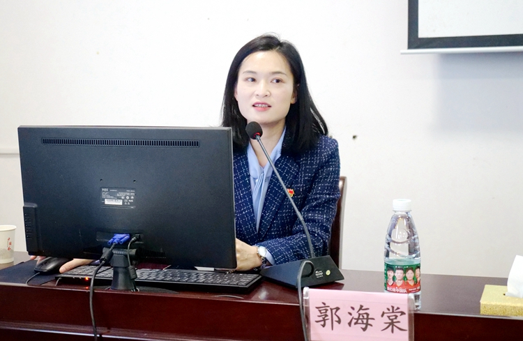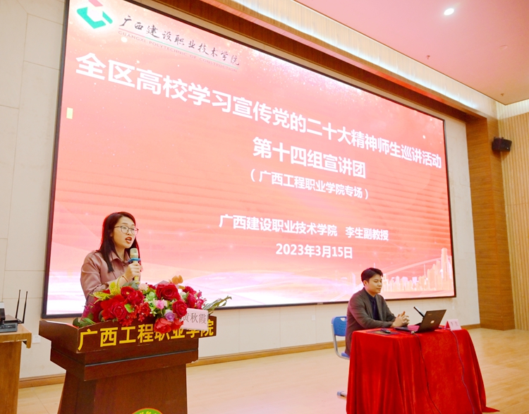 廣西高校黨的二十大精神宣講團(tuán)成員、廣西建設(shè)職業(yè)技術(shù)學(xué)院管理工程學(xué)院團(tuán)總支書(shū)記郭海棠作專(zhuān)題報(bào)告