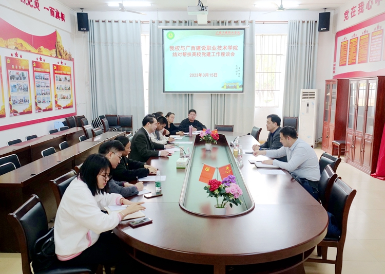 2023年3月15日下午,廣西建設職業(yè)技術學院黨委副書記曾繁雄一行到我校開展結對幫扶高校黨建交流活動,我校黨委書記蒙本曼出席結對幫扶高校黨建交流活動,各黨(總)支部書記參加兩校黨建工作經(jīng)驗交流座談會。
