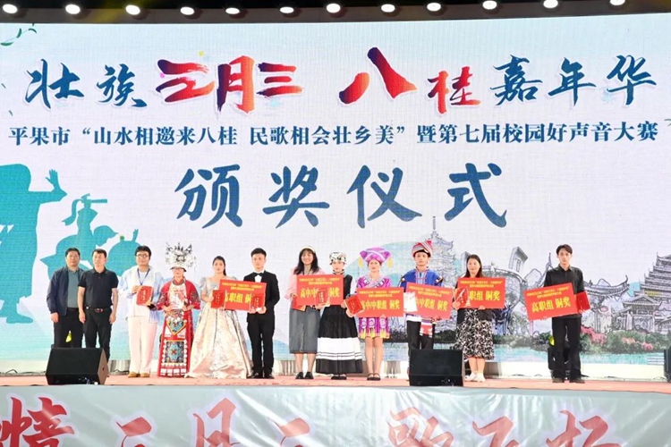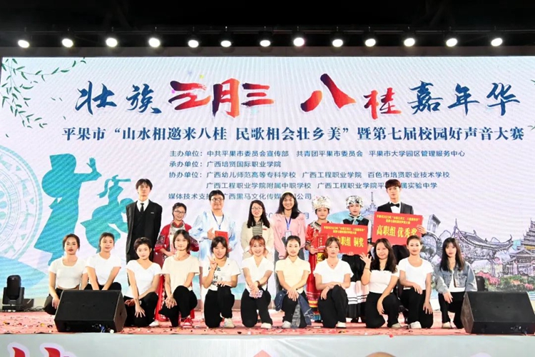 2023年4月14日,學(xué)校黨委副書記黃秋霞帶隊(duì)參加由中共平果市委員會(huì)宣傳部、共青團(tuán)平果市委員會(huì)、平果市大學(xué)園區(qū)管理服務(wù)中心共同主辦的平果市2023年“壯族三月三·八桂嘉年華”暨第七屆校園好聲音大賽,學(xué)校3名參賽選手表現(xiàn)優(yōu)秀,獲得高校組銅獎(jiǎng)1項(xiàng)、優(yōu)秀獎(jiǎng)2項(xiàng)。