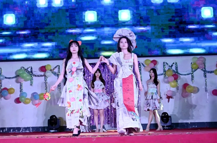 看,在設(shè)計師的精巧構(gòu)思下,舊布料、購物紙袋、報紙、垃圾袋等廢舊物品,經(jīng)過手工畫、剪、拼、貼等工序,變成了精美的“時尚服裝”,在“T臺”上熠熠生輝,讓人目不暇接。觀眾們不由得為同學們的奇思妙想和心靈手巧點贊。