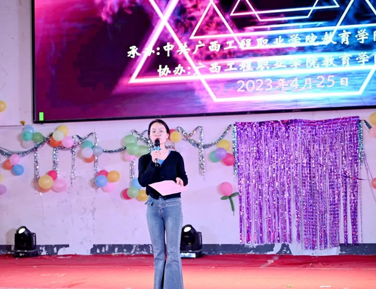 教育學院院長梁鳳琴宣布廣西工程職業(yè)學院教育學院第一屆“弘揚民族文化,展現(xiàn)創(chuàng)新風采”環(huán)保時裝秀開始!