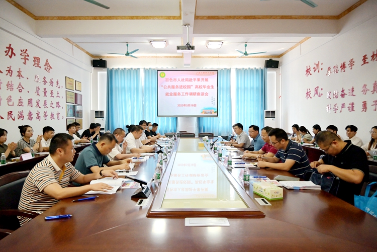 為貫徹落實黨的二十大精神及自治區(qū)、百色市關(guān)于高校畢業(yè)生就業(yè)工作的決策部署,進一步強化高校畢業(yè)生公共就業(yè)服務供給,多措并舉促進高校畢業(yè)生就業(yè)創(chuàng)業(yè),5月18日下午,百色市委組織部副部長、市人力資源和社會保障局黨組書記、局長凌玉強一行來我校開展“公共服務進校園” 高校畢業(yè)生就業(yè)服務工作調(diào)研座談會,平果市人力資源和社會保障局、平果市公共就業(yè)和人才服務中心、大學園區(qū)管理服務中心相關(guān)領(lǐng)導、干部陪同調(diào)研。
