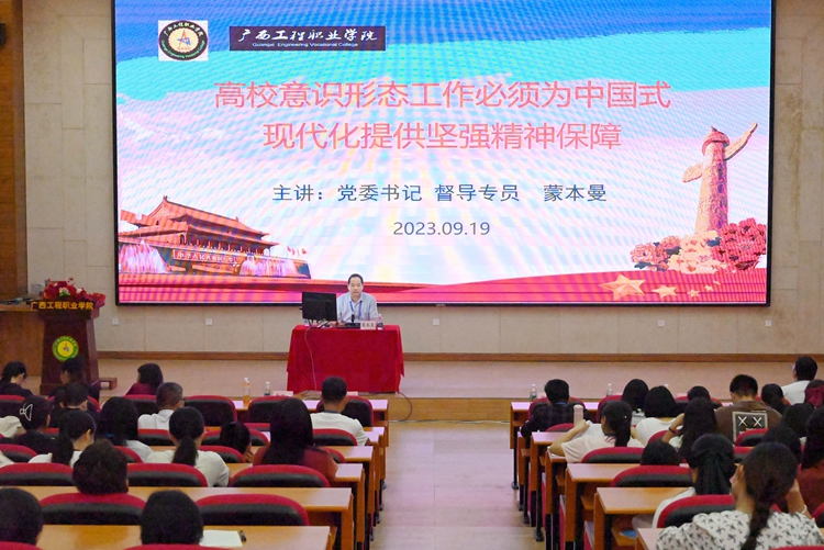 9月19日下午,在圖文信息大樓一樓學術(shù)報告廳,學校召開中國式現(xiàn)代化暨高校意識形態(tài)工作專題報告會,學校黨委書記、督導專員蒙本曼博士作《高校意識形態(tài)工作必須為中國式現(xiàn)代化提供堅強精神保障》專題報告。學校副校長蔣茂麗,學校黨組織書記、副書記,各部門負責人、行政人員,各專任教師和輔導員等400多人參加會議。會議由黨委辦副主任黃香琴主持。