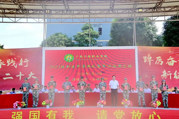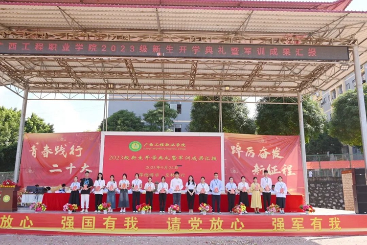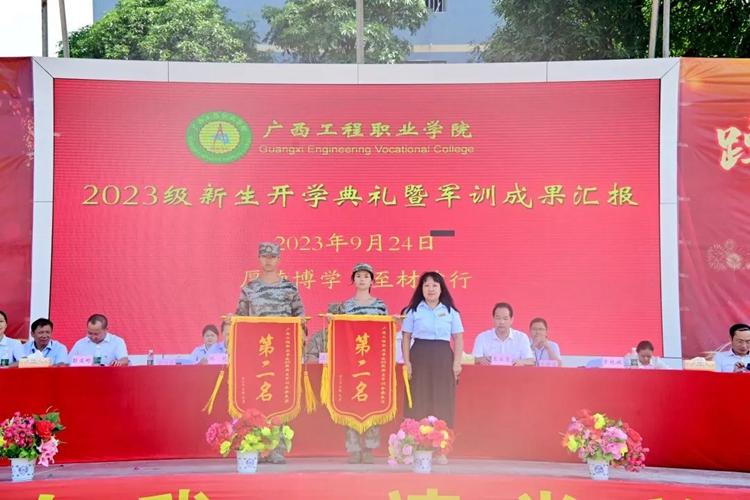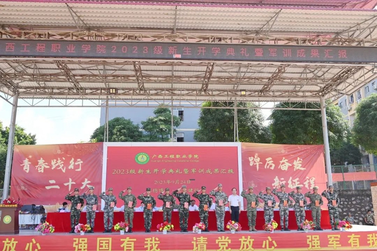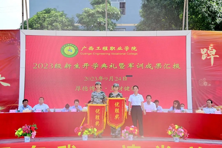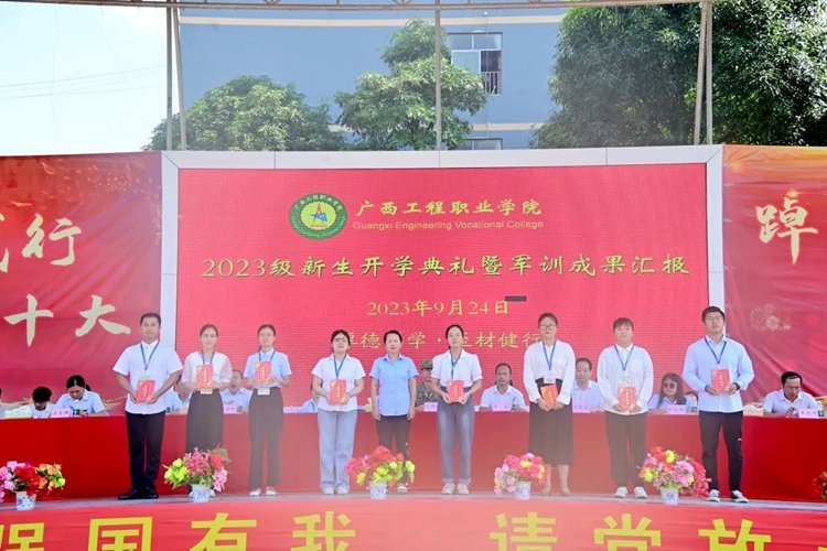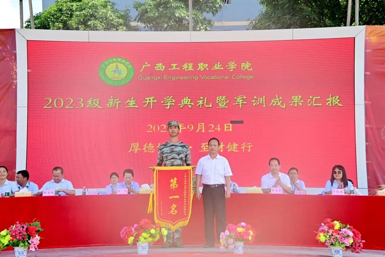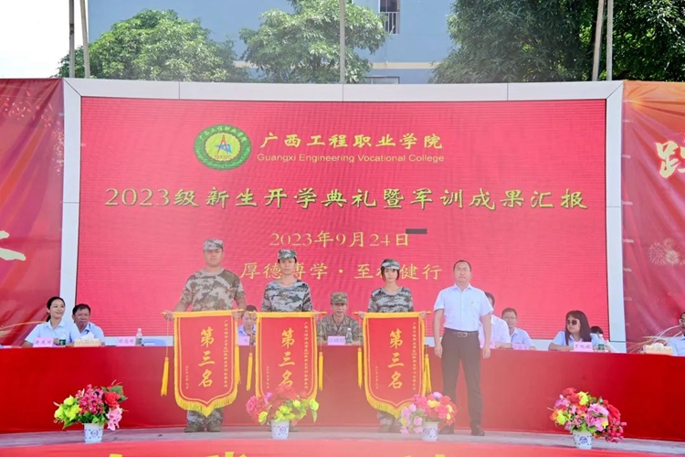 學(xué)校紀(jì)委書記、副校長(zhǎng)彭高彬宣讀《廣西工程職業(yè)學(xué)院關(guān)于2023級(jí)新生軍訓(xùn)先進(jìn)集體和先進(jìn)個(gè)人的表彰決定》,譚書恒等359名同學(xué)被評(píng)為軍訓(xùn)標(biāo)兵,林清霞等8名教師被評(píng)為優(yōu)秀帶班班主任,黃啟東等16名教官被評(píng)為優(yōu)秀教官,楊自恒等20名教師榮獲軍訓(xùn)工作積極貢獻(xiàn)獎(jiǎng),何德杰等57名教官榮獲軍訓(xùn)工作積極貢獻(xiàn)獎(jiǎng),9棟207等43間宿舍被評(píng)為文明宿舍,七營(yíng)等8個(gè)營(yíng)連榮獲軍訓(xùn)會(huì)操表演先進(jìn)集體。出席表彰大會(huì)的領(lǐng)導(dǎo)為獲獎(jiǎng)先進(jìn)集體及個(gè)人進(jìn)行頒獎(jiǎng)。