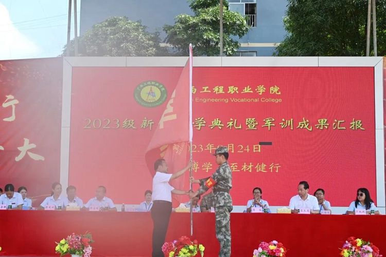 最后,軍訓(xùn)團(tuán)總教官黃啟東轉(zhuǎn)交軍訓(xùn)團(tuán)團(tuán)旗,學(xué)校李益董事長(zhǎng)接軍訓(xùn)團(tuán)團(tuán)旗。至此,廣西工程職業(yè)學(xué)院2023級(jí)新生軍訓(xùn)圓滿完成。