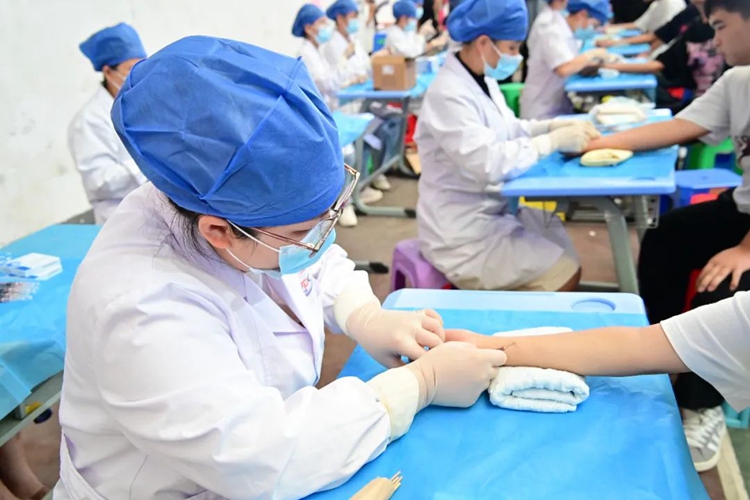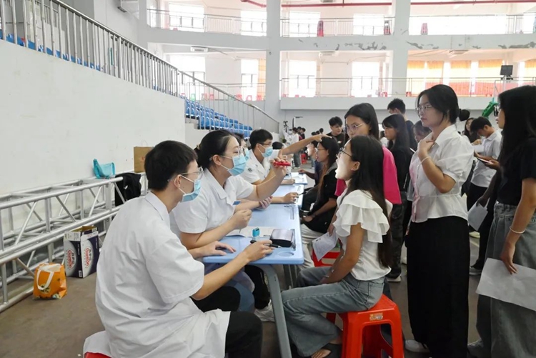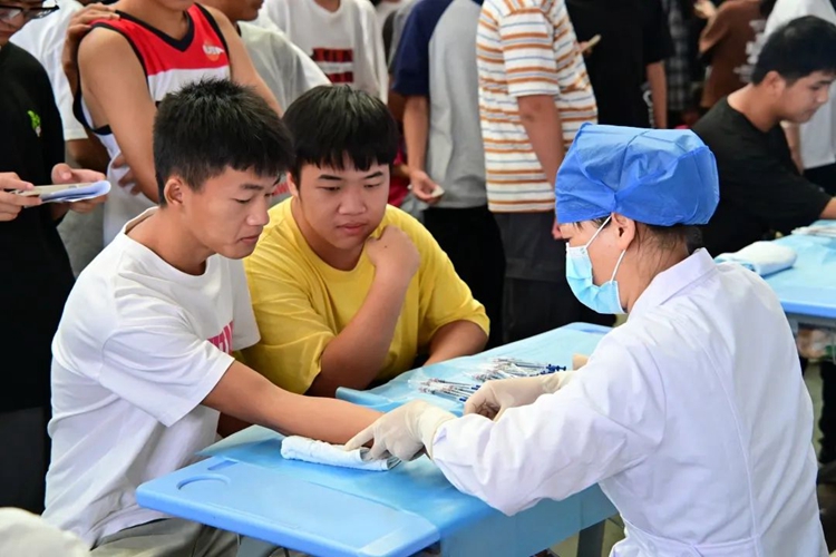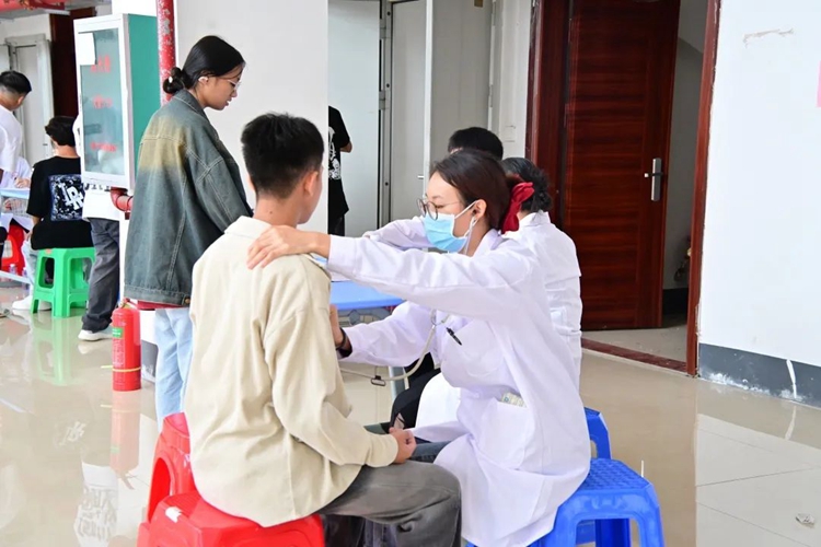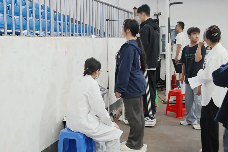 同學們在進行體檢時,醫(yī)護人員一絲不茍地認真開展工作,確保體檢的順利進行