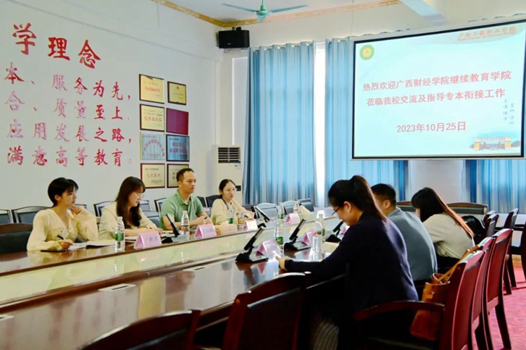 為更好的開(kāi)展專本銜接合作項(xiàng)目,進(jìn)一步保障和提升人才培養(yǎng)質(zhì)量,10月25日,我校邀請(qǐng)廣西財(cái)經(jīng)學(xué)院繼續(xù)教育學(xué)院的領(lǐng)導(dǎo)、老師來(lái)校交流指導(dǎo)專本銜接工作。