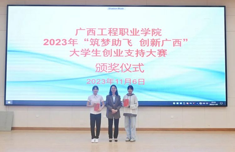 土木工程學(xué)院黨總部支書記、副院長楊竟及汽車與機(jī)電學(xué)院黨支部書記、辦公室主任陸心含為榮獲二等獎(jiǎng)的《校園云資訊》《壯韻—壯錦飾品》項(xiàng)目團(tuán)隊(duì)頒獎(jiǎng)